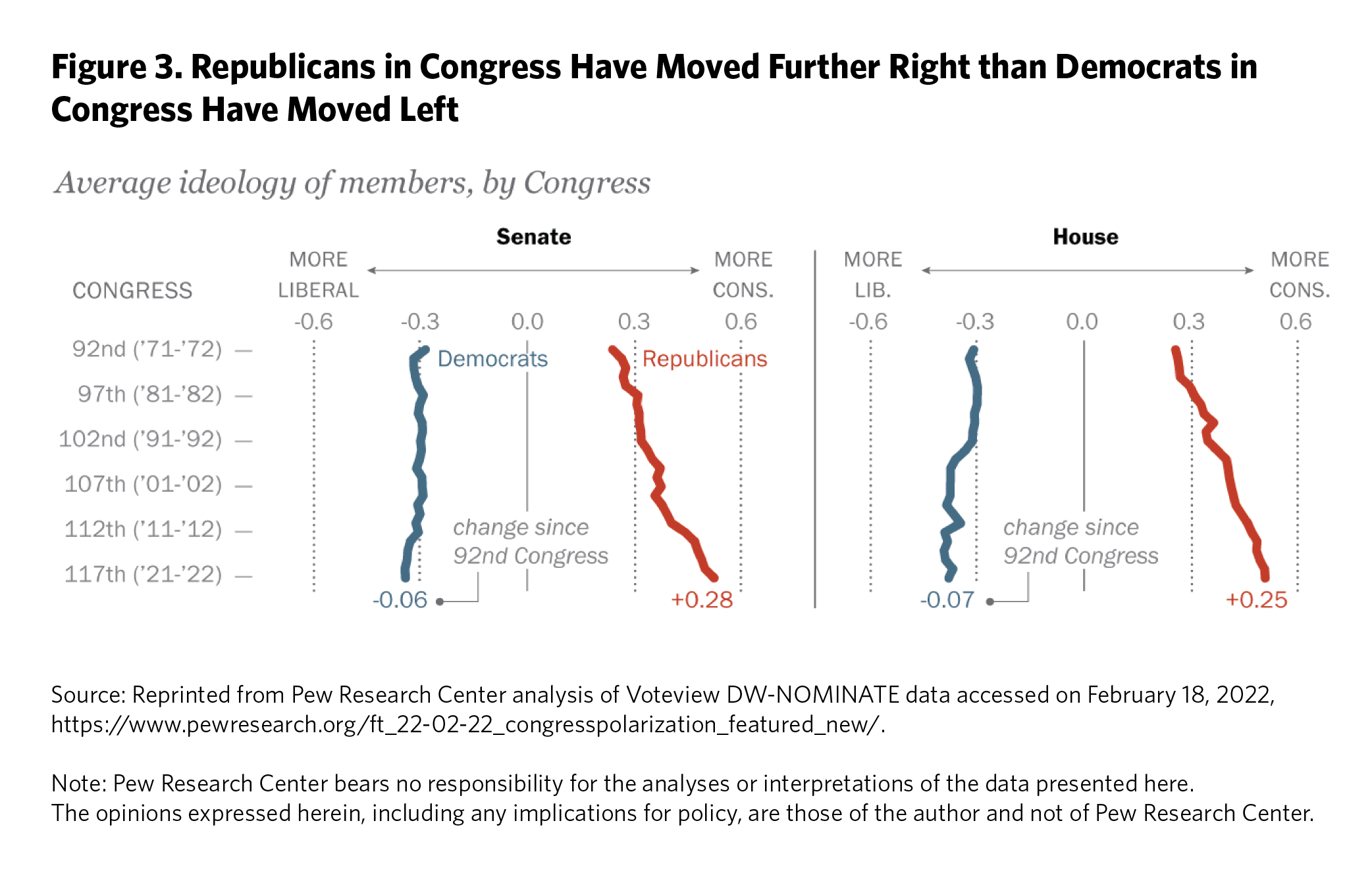 Ideological polarization was highly asymmetric. Republican members of Congress were moving to the right ideologically much faster than Democratic members were moving to the left (see figure 3).