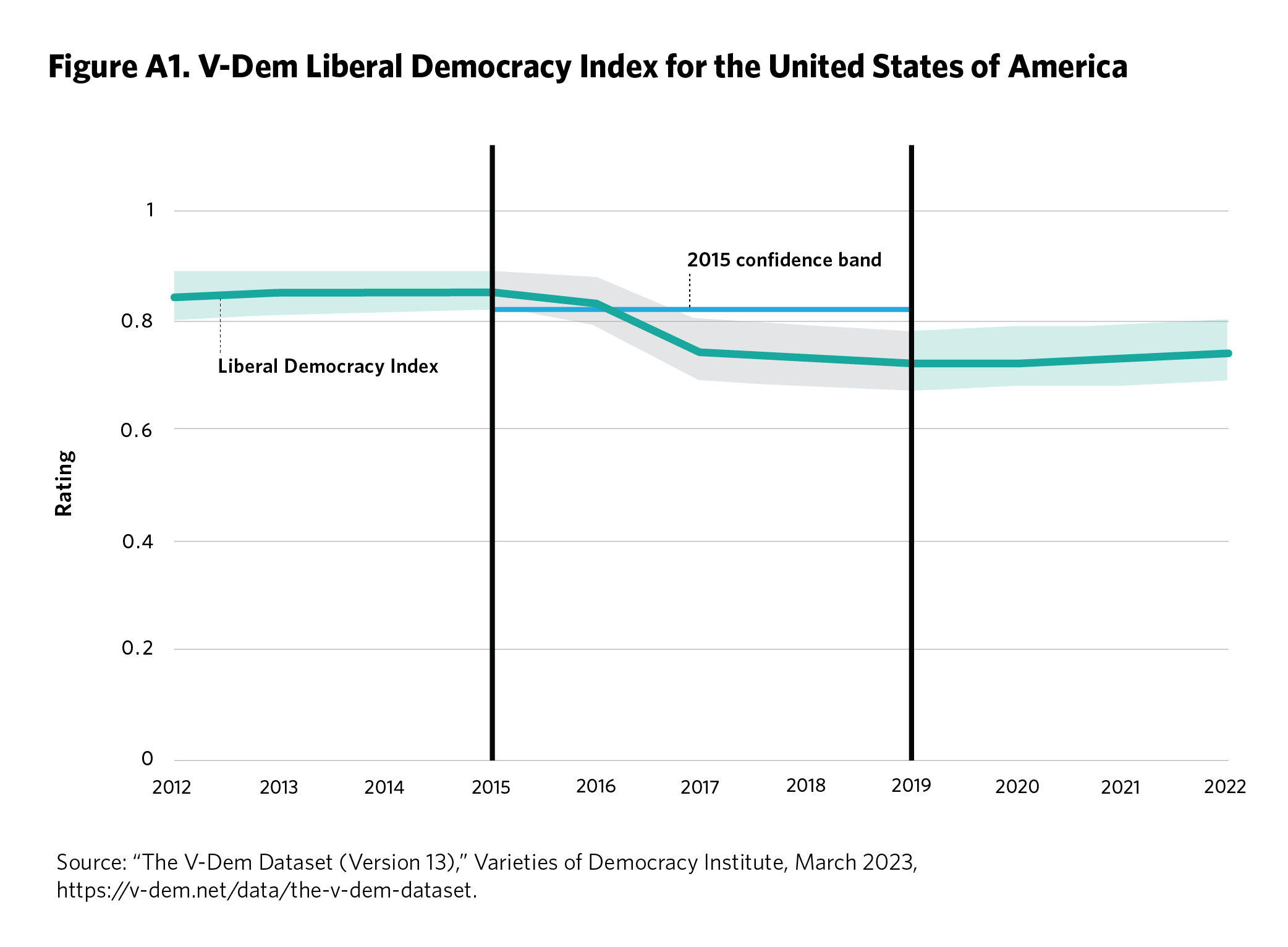 Figure A1 illustrates our case selection and measurement. In this example, we count the 2020 U.S. elections as occurring during backsliding under incumbent Donald Trump and the ruling Republican Party because in the year before the election (2019), the country’s LDI score (0.72) was below the lower bound of the confidence interval (shown in yellow) for 2015—the year before Trump and the Republican Party were elected (0.82). Thus, democratic backsliding occurred during the incumbent candidate’s and party’s time in office prior to the 2020 election.